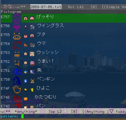 先日行なわれた、Shibuya.lispテクニカルトーク第3回 で id:IMAKADO さんが発表した emoji.el が大変素晴しいです! 発表を見てもらうと分かりますが emoji.el は、 docomo, au, softbank の絵文字をEmacs 上で表示する。 Anything を使った補完入力がごっさ…